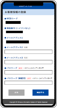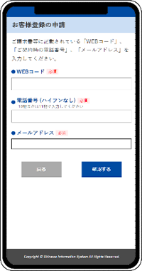 「WEBコード」「電話番号」及び「メールアドレス」を入力し、確認ボタンをタップします。
